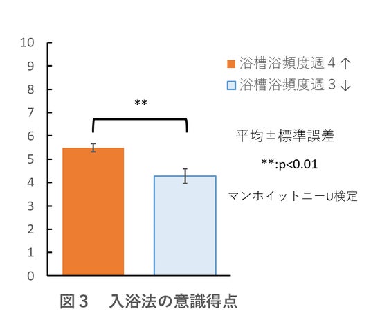 ◆入浴法の意識得点(0-10点)では、高頻度群の得点が有意に高く(図3)、理由として「免疫力を高めたい」、「代謝を良くしたい」との有意な関連が認められました。