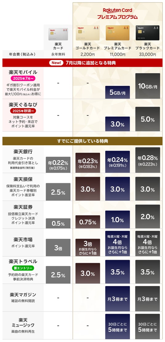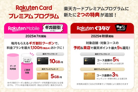 楽天カード株式会社(以下「当社」)は、「楽天カードプレミアムプログラム」において、7月1日(火)から「楽天モバイル」、今秋から「楽天ぐるなび」の特典を追加いたします。「楽天モバイル」特典では毎月、「楽天ブラックカード」の会員様に10GB、「楽天プレミアムカード」の会員様に5GBの「ギガ割引クーポン」を進呈いたします。「楽天ぐるなび」特典では、「幹事ランク制度」において、「楽天ブラックカード」は「エース幹事ランク」が適用されコース金額の5%、「楽天プレミアムカード」は「レギュラー幹事ランク」が適用されコース金額の3%の「楽天ポイント」を進呈いたします(注1)。