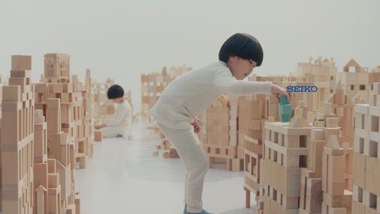 今回の企業CMでは、「時計のセイコー」と「ソリューションのセイコー」の2つの側面を、双子の子どもの姿を通して表現しています。双子が抱える大きな袋から出てきたのは、ソリューションの対象を示す水色の模型と、白木の積み木。セイコーの聖地であるSEIKO HOUSEを中心とした東京・銀座の街を彷彿とさせるような“積み木の街並み”の中に、セイコーのさまざまなソリューションが活躍している様子が映し出されます。そんなセイコーのソリューションが生み出すのは、人々の笑顔です。これからも“心を動かすソリューション”をセイコーは人々に、社会に届けていきます。