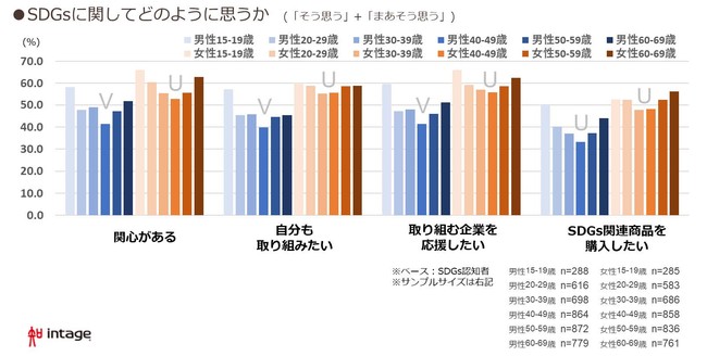 「SDGsに取組む企業を応援したい」はSDGs認知者の53%、「SDGs関連商品・サービスを購入・利用したい」は45%。SDGs意識にも世代差あり。