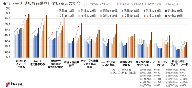 前述の「サステナブルセグメント」の区分けに用いた質問項目の回答結果から、世代間に行動の差があることが見えてきました。