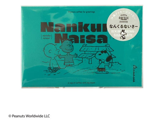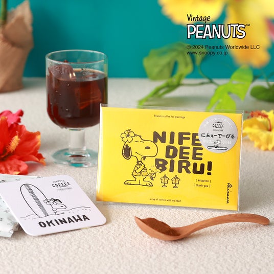 方言を用いた温かみのあるメッセージとピーナッツのキャラクターが描かれた封筒の中に、地域の素材をブレンドしたコーヒー1杯分とコースター1枚が入っています。宛名を書いて切手を貼れば、ポスト投函も可能なギフトです。