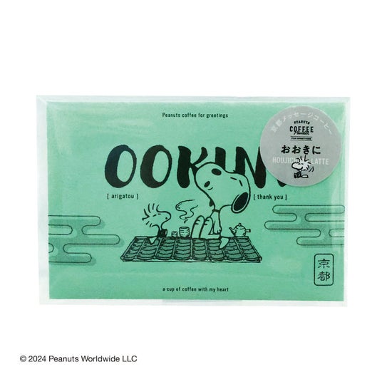 優しいグリーンをベースに瓦屋根でほっと一息つくスヌーピーとウッドストックを描き、ほっこり癒されるデザインに仕上げました。湯呑みを加えることでほうじ茶の味わいとリンクさせていることもポイントです。ありがとうのメッセージと一緒に「お疲れさま」などのねぎらう気持ちを贈りたい時にもぴったりです。