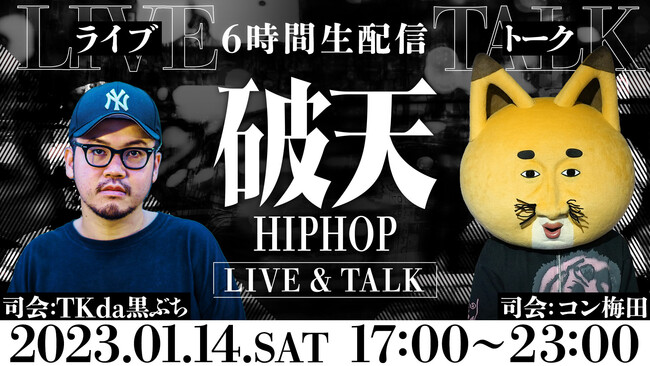 株式会社イザナギゲームズ(東京都江東区、プロデューサー兼CEO:梅田慎介)は、6時間に及ぶ生配信『破天HIPHOP LIVE&TALK』を破天MICROPHONE公式YouTubeチャンネルにて、2023年1月14日(土)17時より実施することを発表いたしました。