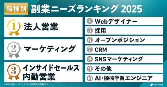 2025年の副業募集では、法人営業/マーケティング/採用など、売上創出や組織づくりに直結する職種が上位にランクインしました。
