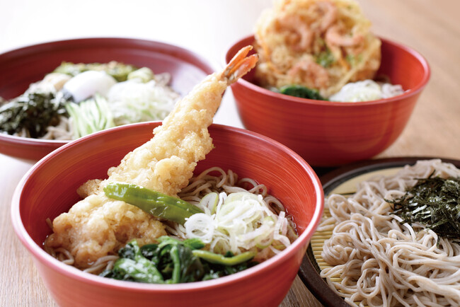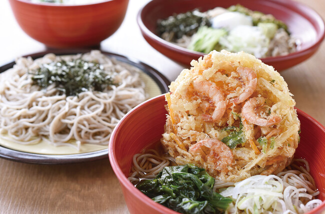 「箱根そば本陣」ブランドは、小田急線沿線を中心に展開するスタンドそば店「箱根そば」のワンランク上の味として、そば粉に外皮入りの粗挽き粉を配合した香りの濃いこだわりの蕎麦、小海老を使用して1枚1枚丁寧に手揚げしたかき揚げ天をご提供しています。