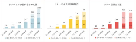 国内の母乳バンクは、日本母乳バンク協会と一般財団法人日本財団母乳バンク(※2)(理事長:水野 克己、以下略:日本財団母乳バンク)の2法人で運営をしています。2023年度、日本国内においてドナーミルクを使用した赤ちゃんの人数(※3)は1,118人、利用病院数(※3)も95施設に増加し、提供量・提供拠点が着実に増加しております。