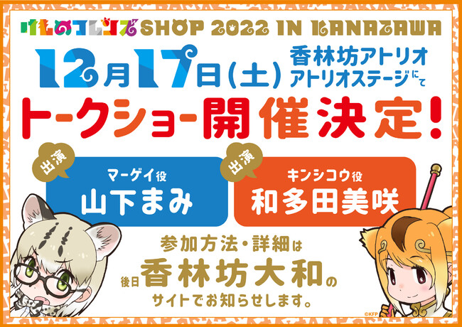 さらに、初日の12月17日(土)には、「けものフレンズSHOP 2022 IN KANAZAWA」開催記念として、マーゲイ役の山下まみとキンシコウ役の和多田美咲によるトークショーを開催することが決定。
