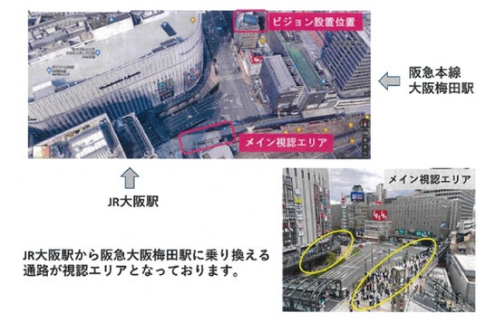 大阪梅田駅前に2023年1月に設置された、100平米超の3D動画を楽しめるビジョンです。JR大阪駅と阪急大阪梅田駅を繋ぐペデストリアンデッキから視認可能な約104平米のビッグサイズのビジョンで、目の錯覚により3Dに見えるカーブ型のLEDビジョンが特徴的です。7時から23時の毎時、1日17回時報が流れます。通行者が多く行きかうペデストリアンデッキの立地により、多くの通行人が目にする梅田最大級のビジョンです。