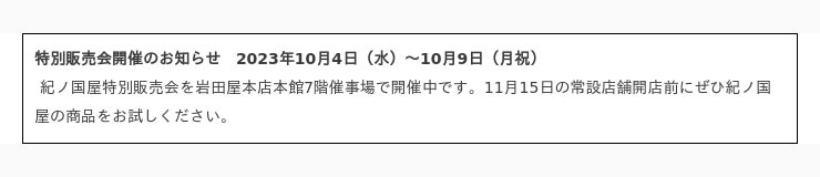 10月9日(月祝)まで紀ノ国屋特別販売会を本館7階催事場で開催中