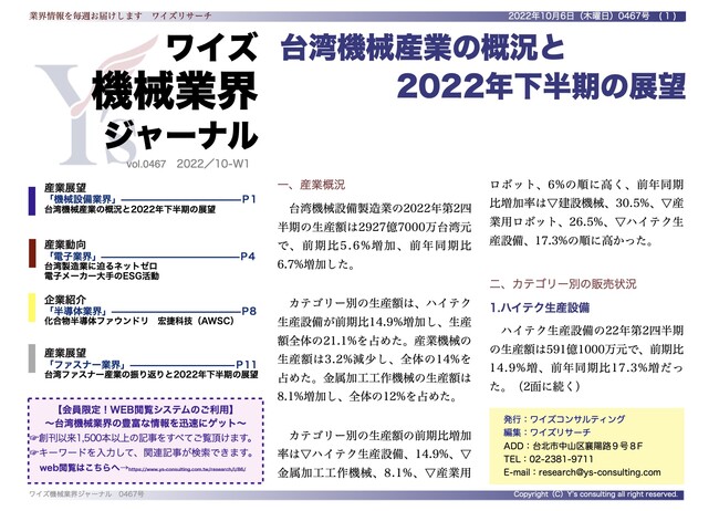 ワイズコンサルティング グループ(本社:中華民国台北市、代表取締役:吉本康志)は台湾機械業界専門誌「ワイズ機械業界ジャーナル」の2022年10月第1週号を発行しました。今週号では、機械設備業界、電子業界、化合物半導体ファウンドリのAWSCとファスナー業界の動向を紹介します。