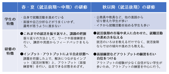春・夏の「就活前期~中期」と、秋以降の「就活後期」とでは、学生の状況や、学生が求める支援内容が異なるため、当社は、それぞれの時期の学生に合わせた就活対策研修を実施しています。