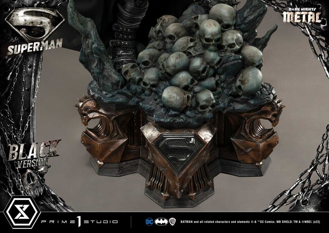 ヘヴィメタル調のディテール、両肩とベルトのドクロ、大胆なアレンジが目を引くSマーク。「ダークナイツ:メタル」の世界観が表現されたコスチュームを、黒く染め上げたのが本スタチューです。