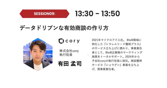 株式会社マイクロアド(本社:東京都渋谷区、代表取締役 社長執行役員:渡辺健太郎)の子会社である株式会社cory(本社:東京都渋谷区、代表取締役:諏訪 優太、以下cory)は、8月28日(水)に株式会社NewsTV(本社:東京都港区、代表取締役:杉浦 健太)が主催するカンファレンス「Sales DX conference 2024『データ × セールス』これからのデジタル時代で成果を出し続けるために」に登壇いたします。