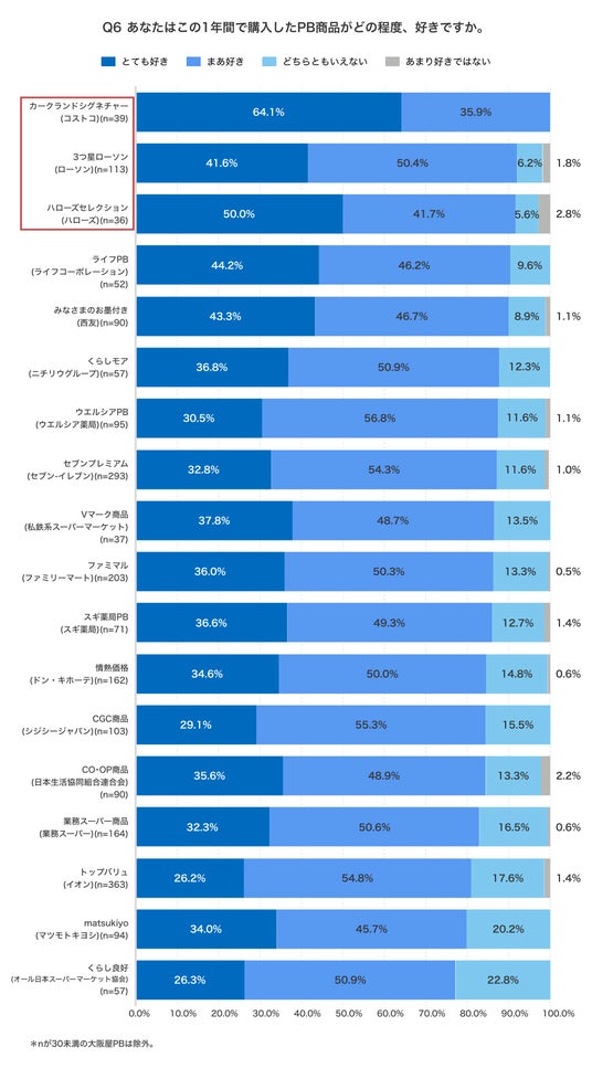 直近1年間で購入したPB商品について、どの程度好きかを聞いたところ、「好き」(「とても好き」と「まあ好き」の合算)は、「カークランドシグネチャー(コストコ)」(100.0%)、「3つ星ローソン(ローソン)」(92.0%)、「ハローズセレクション(ハローズ)」(91.7%)の順でした。