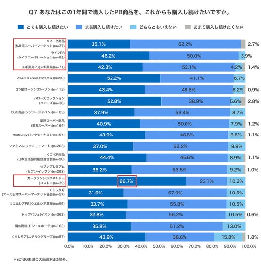 なお、「とても購入し続けたい」に着目すると、「カークランドシグネチャー(コストコ)」が66.7%と圧倒的に高い結果となりました。