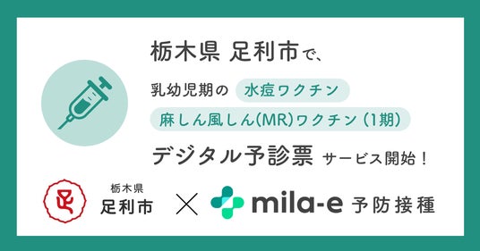 株式会社ミラボ(本社:東京都千代田区、代表取締役:谷川一也、以下「ミラボ」)が、栃木県足利市で導入する乳幼児期の予防接種に関する手続きや予診票をデジタル化する「mila-e(ミライー) 予防接種」において、2024年4月より対象ワクチンおよび対象医療機関の範囲を拡大し、麻しん風しん(MR)ワクチン(1期)・水痘ワクチンを追加することが決定しました。