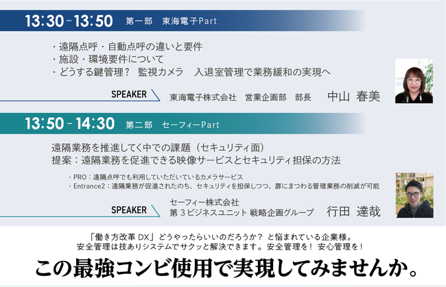 飲酒運転防止のためのアルコール検知器及びIT点呼システムを開発・販売する東海電子株式会社(本社:静岡県富士市 代表取締役:杉本 哲也)は、 この度、セーフィー株式会社(本社:東京都品川 代表取締役社長CEO:佐渡島 隆平)とのコラボウェブセミナー「<点呼システム&防犯カメラ>技ありシステムで遠隔業務を実現!管理者の労働時間を削減」を3月27日(月)に無料開催いたします。