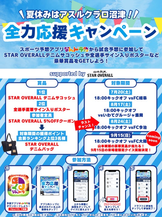 イノベーションの力で新たなスポーツ・エンターテインメントを創造し、まだ見ぬ感動と熱狂を提供するアプリ「なんドラ」を運営する株式会社なんでもドラフト(本社:東京渋谷区、代表:森井啓允)は、7月~9月のアスルクラロ沼津 ホーム及びアウェイ4試合対象の試合展開予想で、山本被服株式会社協賛の夏休み全力応援キャペーンを開催中です。