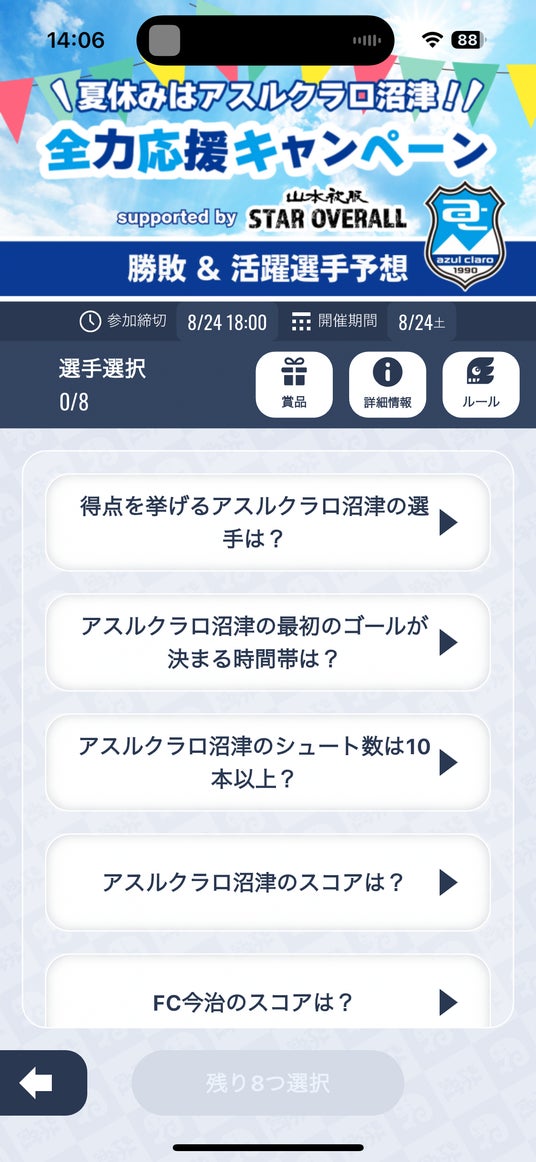 7月・8月のホーム及びアウェイ3試合の試合展開予想と山本被服クイズに答えて、1位の成績を獲得した方1名様に山本被服のデニムブランド「STAR OVERALL」のデニムサコッシュを、2位の方1名様にはアスルクラロ沼津全選手直筆サイン入りポスターをプレゼント!