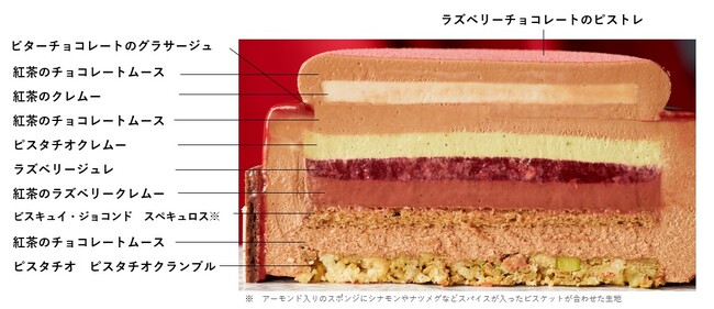 今年のケーキのテーマは紅茶。ベリーやバニラを彷彿させる芳醇な香りが特徴の紅茶をメインに、ベリー系のチョコレートやラズベリーの酸味で華やかさをプラス、そこに滑らかな甘みのミルクチョコレートを纏わせ老若男女問わず楽しんでいただける味わいに仕上げております。また、ピスタチオの芳ばしいナッティーな味わいや、ビスキュイに忍ばせたシナモンやクローブ、カルダモンなど冬定番のスパイスが鼻腔をくすぐらせ、隅々までクリスマスの余韻に浸ることが出来るケーキです。