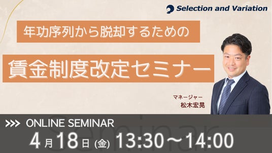 組織・人事コンサルティングファームであるセレクションアンドバリエーション株式会社(以下、当社、東京都千代田区丸の内、大阪市西区、名古屋市西区 / 代表取締役社長:平康慶浩/ URL:https://sele-vari.co.jp/ )は『年功序列から脱却するための賃金制度改定セミナー』を2025年4月18日(金)13:30~14:00に開催することをお知らせいたします。