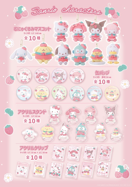 キャラクターラインナップ(全10種):ハローキティ・マイメロディ・クロミ・マイスウィートピアノ・シナモロール・ポムポムプリン・ポチャッコ・ハンギョドン・ぐでたま・あひるのペックル