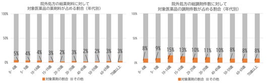 【図2】院外処方の薬剤料と調剤件数に対して対象医薬品の薬剤料と調剤件数が占める割合(年代別)