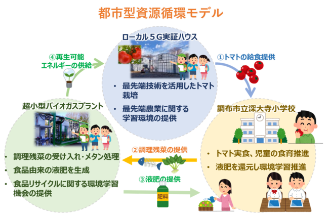 本取り組みでは、バイオガスプラントを活用して給食調理残菜が再生可能エネルギーや液体肥料が生産される仕組みについて理解を深めます。また、実際に液体肥料を学校の花壇等に還元するなどの環境学習にも取り組みます。併せて、調布市立深大寺小学校の給食にローカル5G実証ハウスで栽培したトマトを提供し、児童によるローカル5G実証ハウス見学を通じてこれまでの食育に関する取り組みの一層の理解醸成を図ります。