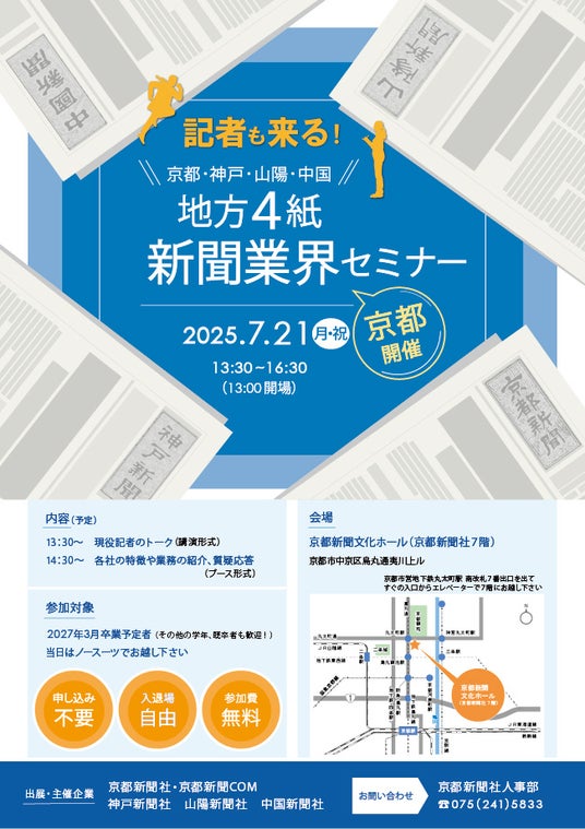 京都新聞社、神戸新聞社(兵庫)、山陽新聞社(岡山)、中国新聞社(広島)の4新聞社が、地方紙の魅力や働きがいを各社ごとに紹介する「地方4紙 新聞業界セミナーin 京都」を、7月21日(月・祝)に京都市内で開催します。