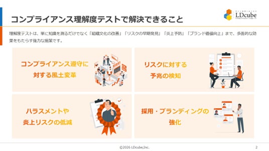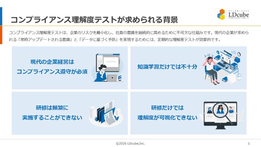 研修のスタイルにとらわれない企業向け人材育成サービスを提供する株式会社LDcube(本社:東京都千代田区、代表取締役社長:新井澄人、以下「当社」)は、「コンプライアンスの『意識と知識』を定着させるには?~効果的な理解度テスト実施のポイントを解説!」と題してウェビナーを開催しますので、お知らせします。