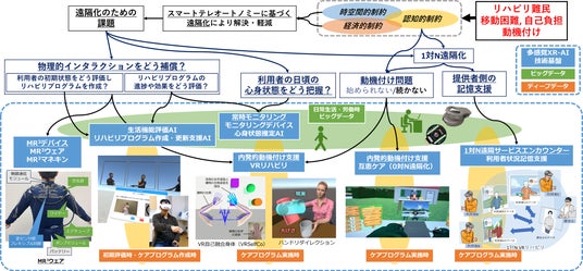 オンラインビデオ通話形式や非没入型VRを活用した遠隔リハビリ事業が増加し、XRリハビリも海外で進展していますが、遠隔とXRを両立させた事例は国際的にも多くありません。この理由として挙げられているのは、ヘッドマウントディスプレイなどのXR機器の装着やリハビリアプリの使用感、メタバースへの参加といった利用体験が、ユーザーの期待する価値を十分に満たせていないことです。さらに、遠隔化によってトレーナーや医師、看護師などの存在感が希薄になったり、実際の疾患を持つリハビリサービス利用者(患者を含む)の精緻な心身機能のアセスメントが困難になることで、運動訓練継続の動機付けが難しくなることも大きな課題でした。