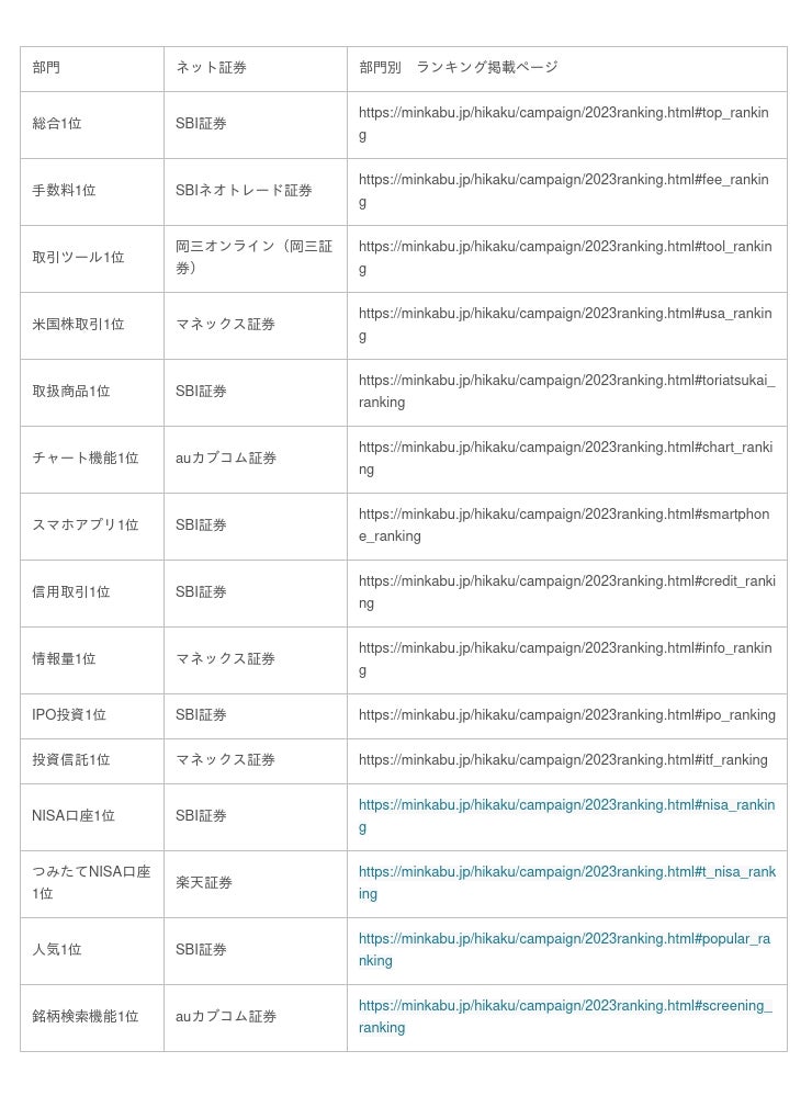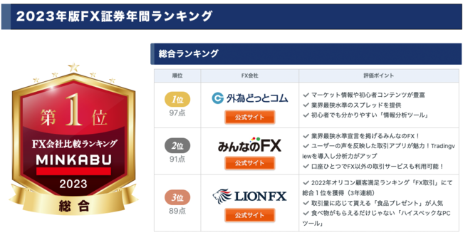 株式会社ミンカブ・ジ・インフォノイド(以下「ミンカブ」、本社:東京都千代田区、代表取締役社長 兼 CEO/CFO:瓜生 憲)は、運営する「MINKABU(みんかぶ)」(https://minkabu.jp/)に掲載しているネット証券比較と、FX会社比較における2023年版年間ランキングを発表いたしました。