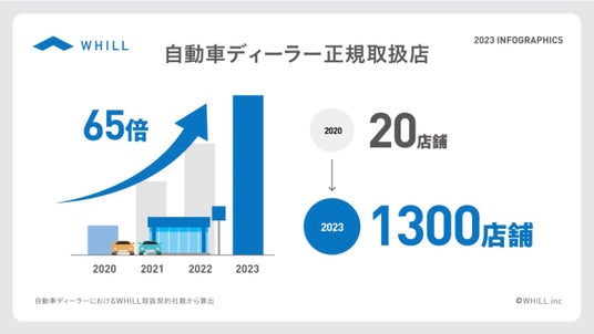 近距離モビリティWHILLの取扱店舗総数(介護/非介護チャネル含む)は全国約3,000店舗に増え、うち自動車ディーラーに限ると非介護チャネルの開拓を本格化させた2020年から1,300店舗に拡大しました。