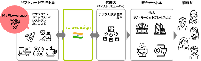 本連携によりバリューデザインは、インド国内約3億人の消費者にアプローチ可能なディストリビューター6社を介した流通ネットワークに紐づくギフトカード提供パートナーとして、MyFlowerapp.comのフラワーギフトをラインナップに追加し、ネットワークの拡充を図ります。