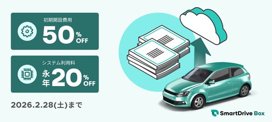 今回のキャンペーン期間中お申込みいただいた下記対象の企業様に限り、当社の車両に関する書類DXを促進するクラウドサービス「SmartDrive Box」を導入する際の初期開設費用が50%オフ、システム利用料も永年20%オフでご利用いただけ、費用を抑え、お得に利用を開始していただくことが可能となります。本キャンペーンは年度末を迎えるにあたり、年度末の車検・点検書類の整理に追われる担当者の負担を軽減いただくことを目的としています。