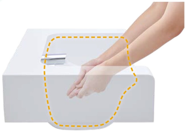 手洗い時の手の動作領域を検証し、指を伸ばした状態で手首まで洗い流せ、腕やひじも洗いやすいボウル形状を実現しました。“正しい手洗”が無理なくラクにできます。