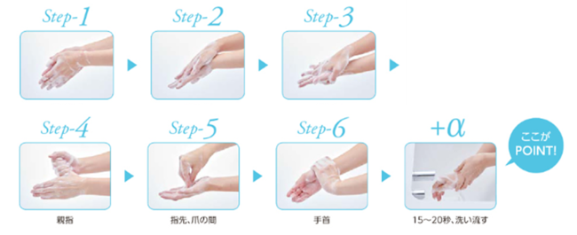 6つのSTEPに沿って、手のひらから手首までまんべんなくこすり洗った後に、15~20秒くらいをかけて水できれいに流すことが重要です。