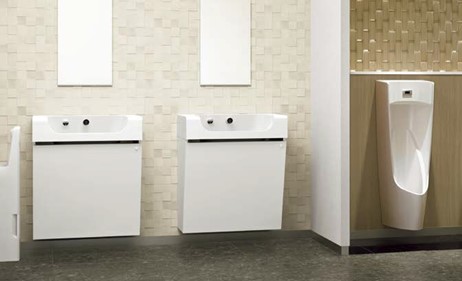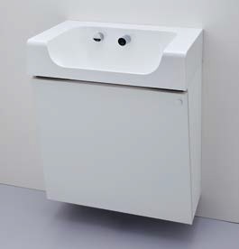 中小規模のオフィスや店舗の手洗いスペースや、福祉施設などのエントランスに設置いただくことができます。ボウルは新しく開発した人造大理石製で、重量がわずか8kgととても軽く、作業員一人でも運搬・搬入・設置が可能です。