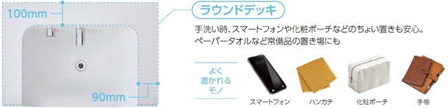 さらに、ボウル手前、両サイド、物置スペースにいたるまで、水ハネをしっかりガードして、ボウル周りがぬれにくく清潔を維持しやすいほか、ボウル天面にラウンドデッキを設置することで、スマートフォンや手帳など小物を置くのに便利な形状になっています。