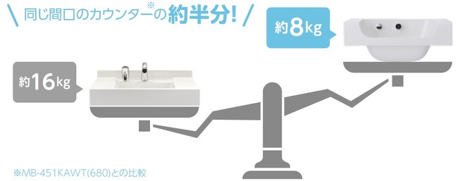 新しく開発した人造大理石のボウルは、重量がわずか8kgと従来の同じ間口のカウンタの約半分の重さです。とても軽いため、作業員一人でも運搬・搬入・設置が可能です。