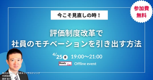 ビジネスマッチングサービス「Ready Crew(レディクル)」を運営する、フロンティア株式会社(本社:東京都渋谷区、代表取締役社長:高橋 政裕、以下 当社)は、2025年4月25日(金)に、「今こそ見直しの時!評価制度改革で社員のモチベーションを引き出す方法」を開催いたします。本セミナーでは、評価制度改革の専門家である株式会社HCM人的資本コンサルティングの藤原俊介氏を講師に迎え、企業の成長を支える最新の評価制度のトレンドや、実際に成果を上げた企業事例を交えながら、実践的なポイントを解説します。