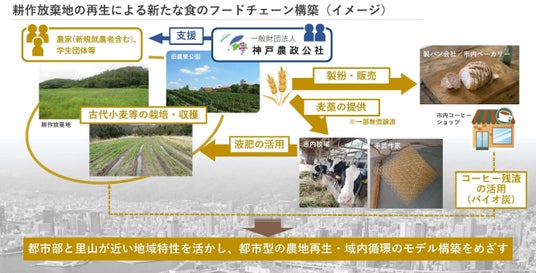 神戸市では、耕作放棄地で活動する従事者を増やし、その従事者が一定の収入を得る仕組みづくりや、付加価値のある農作物の持続可能なフードチェーンを達成することに挑戦しています。耕作放棄地で育てる農作物として選んだのは、「古代小麦」です。古代小麦はパン用小麦の原種で、農薬をあまり使わずに育てられる点や栄養価が高い点に着目しました。古代小麦などの付加価値のある農産品の栽培により、耕作放棄地の活用と新たな栽培者の参画を促し、新たな食のフードチェーンの確立による都市と里山の資源循環モデル構築を目指しています。