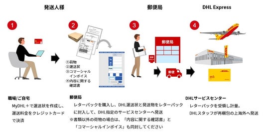 DHLをクレジットカード払いでご利用になることを条件に、レターパックを使って郵便局やポストへ投函すれば、DHL Expressが利用可能です。