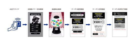 お客さまは店頭に設置された専用什器にご自身のスマートフォンをタッチすることで、様々な特典クーポンをその場で獲得・利用することができます。店舗においては、お客さまへの販売促進効果とブランドイメージの向上が期待できます。
