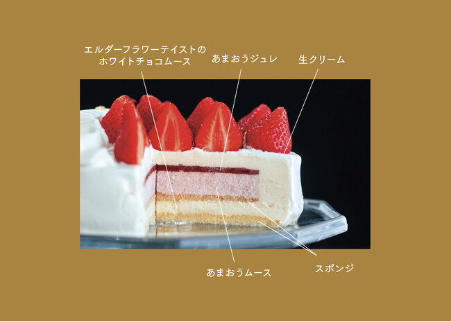 1層目は空気を含んだ軽い口当たりのスポンジ生地に、エルダーフラワーを効かせたホワイトチョコレートのとろけるムースを重ねました。希少なナチュラルカカオバターのみで作るホワイトチョコレートは、花や果実の風味広がる豊かな味わいです。3層目にスポンジ、4層目に今が最旬のあまおうの美味しさを凝縮したムースとジュレを重ね、最後に滑らかな生クリームで全体を包みました。 苺、生クリーム、チョコレート、王道の味わいを全て堪能できるケーキに仕上げました。
