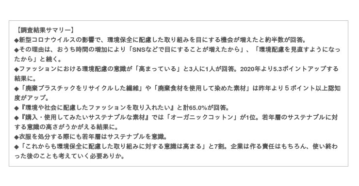 豊島株式会社(代表取締役社長:豊島半七、名古屋市中区錦2-15-15)は、2014年より、サステナブル素材に関する調査を実施しています。今回は新たにコロナ禍で、サステナブルに関する意識がどのように変化したかなどの調査を加え、全国の15歳~49歳の男女1,000名を対象に、ファッションへの環境意識調査を実施しました。