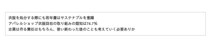 近年、アパレルショップなどの店頭で不要になった服を回収する取り組みが増えています。『アパレルショップの衣服回収の取り組み』の認知は、計74.7%となりました。しかし、「持ち込んだことがある」と回答したのは20.6%にとどまる結果となっています。