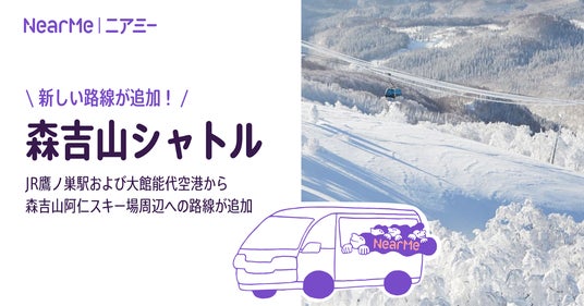 移動の課題に取り組むソーシャルデザインカンパニーの株式会社NearMe(本社:東京都中央区、代表取締役社長:高原幸一郎、以下:ニアミー)と、秋田県北秋田市(市長:津谷永光)は、事前予約とシェアによっておトクでスムーズな移動サービス『森吉山シャトル(阿仁合駅~森吉山阿仁スキー場)』の運行を既に実施しておりますが、JR鷹ノ巣駅および大館能代空港~森吉山阿仁スキー場を結ぶコースを『森吉山シャトル』の新路線として12月28日(土)から運行を開始します。また、新路線の運行開始に伴い、本日、12月26日(木)より事前予約を開始します。