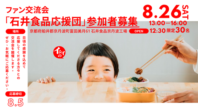 無添加調理※で商品作りを進めている石井食品株式会社(本社:千葉県船橋市、代表取締役社長執行役員:石井智康、以下、「石井食品」)は、2023年8月26日(土)に夏休みに小学生向けの親子でたのしめる第2回「石井食品ファン交流会」を石井食品京丹波工場(京都府船井郡京丹波町富田美月61)で開催し、本日2023年7月26日(水)より応募受付をスタートいたします。※石井食品での製造過程においては食品添加物を使用しておりません。